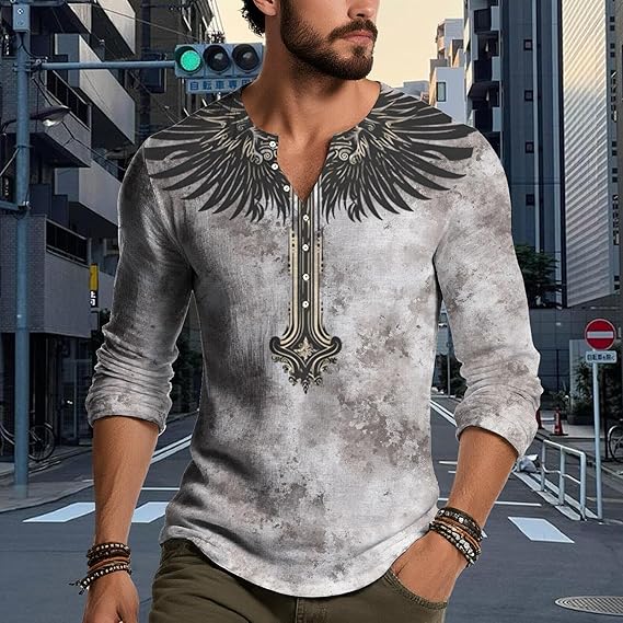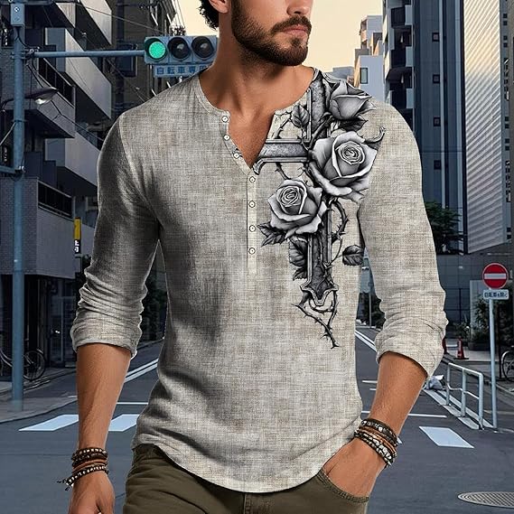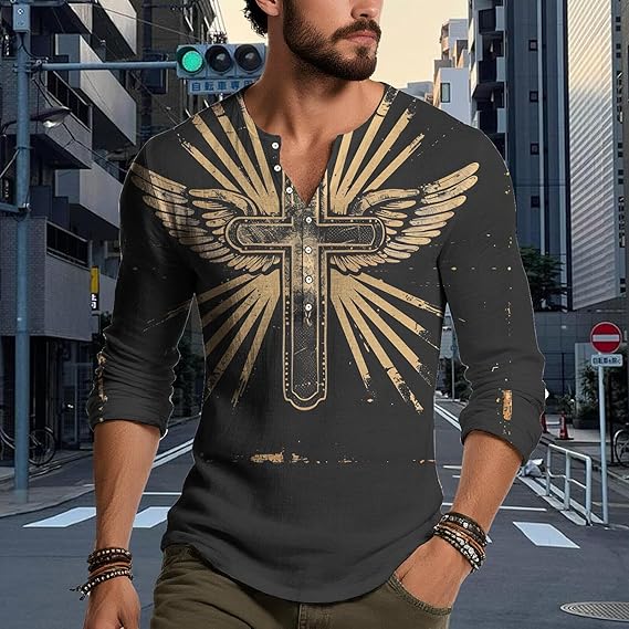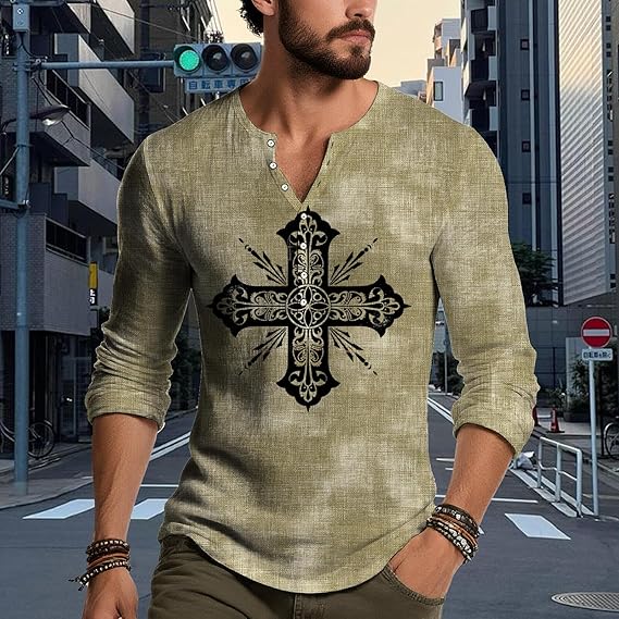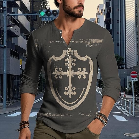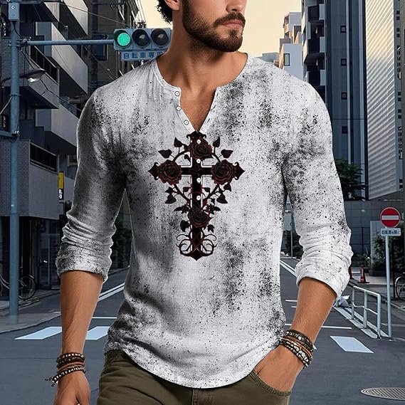 • Material:Mens gothic cross graphic henley shirt is made of high-quality Polyester fabric,which is soft,comfortable,breathable and casual loose,lightweight and skin friendly,It’s comfortable to wear in autumn and summer,Good quality and retro fashion style