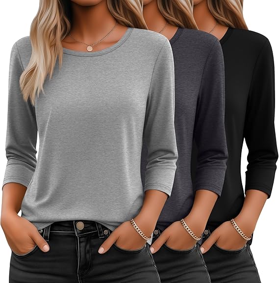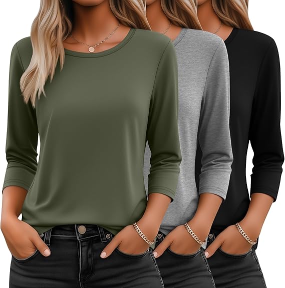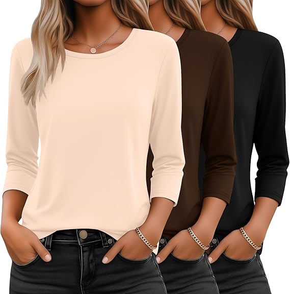Seasonal Essentials Tops: if you’re looking for a loose-fit elbow-length top for women, to transition into summer; Then our basic tops for women pack is a good choice; This top is ideal for layering or on its own; Stay warm in winter with jackets, and coats; Stay cool in the hot season, and look effortlessly stylish worn alone or layered under sweaters and jackets in spring and fall, these round neck 3/4 sleeve tops will be a must-have in your wardrobe